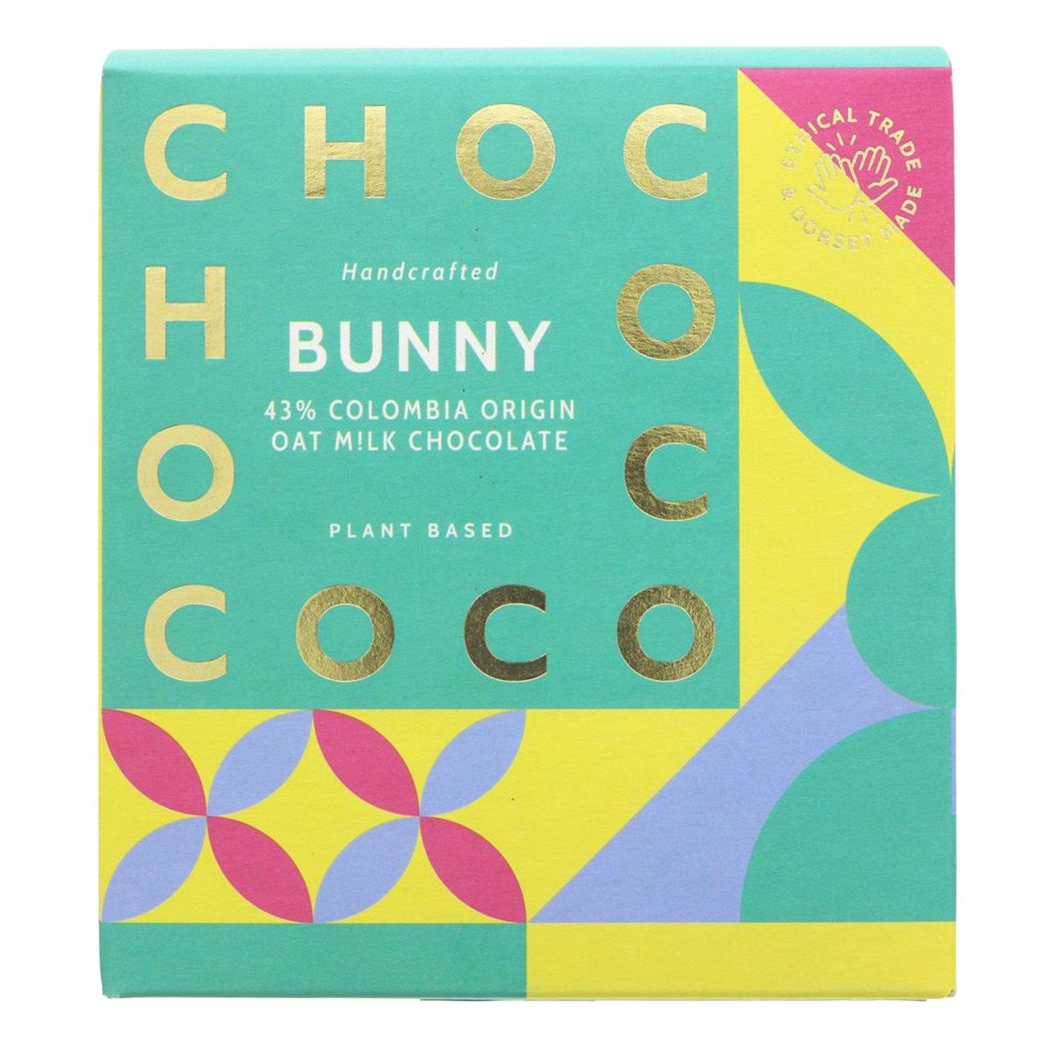 Oat M!lk Chocolate Easter Bunny ingredients: Colombia origin oat m!lk chocolate 100% (sugar, cocoa butter, dried gluten-free oat powder, cocoa mass, dried rice powder, sunflower lecithin, vanilla extract), decorative finish (cocoa butter, calcium carbonate, safflower, spirulina, lemon, sweet potato, radish, cherry, apple). Chocolate contains 43% (min) cocoa solids.
